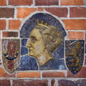 Dit reliëf van koningin Wilhelmina is oorspronkelijk gemaakt voor de raadzaal van het nieuwe gemeentehuis in Mook,