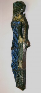 Meerkleuren faience, h. 140 cm, b. 51 cm, op ijzeren steun, ges. JAC MARIS onder op rechter zijkant