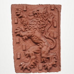 Waarschijnlijk is deze geklauwde en getongde leeuw met blokjesmotief aangebracht in de jaren vijftig.