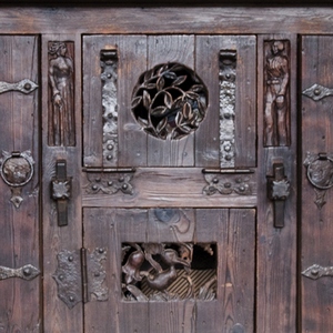 Wat de stijl betreft sluiten de verticale gesneden figuren uit deze kast aan