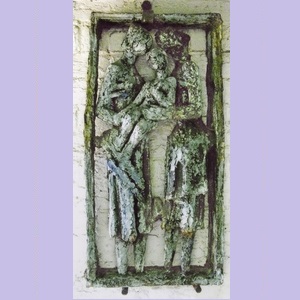 Keramiek, met blauwgroene glazuur, h. 110 cm, ges. l.o. Jac Maris (noordelijke buitengevel)
