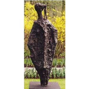 De bruid is opgezet met de sterk vereenvoudigde compacte vormgeving en hoekige contouren van het late werk van Jac Maris.
