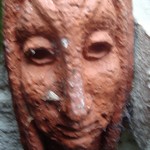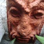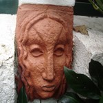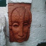 Na de oorlog verluchtte hij de raamstijlen met allerlei motieven en bracht hij deze vijf terracottakopjes aan.