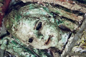 Onder de voorstelling zien we een wijnstok waarvan de vruchtdragende ranken als ronde omlijsting doorlopen. Die verwijzen naar de woorden van Christus: Ik ben de wijnstok en gij de ranken. Wie in Mij blijft, zoals ik in hem, die draagt veel vrucht, want los van mij kunt gij niets (Joh 15,5). De ranken hier dragen rijkelijk vrucht, de overledenen, verbeeld door de engelenkopjes (afb. 3b) rond de voorstelling, kunnen dus onbevreesd voor de Heer verschijnen. Mogelijk ook verwijzen de kopjes rond het fries naar de versregels: Ik zag de zielen van hen die onthoofd waren om het getuigenis van Jezus en het woord van God (Apok 20,4).