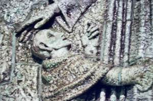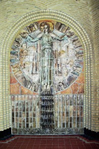 Het tweede grote reliëf sluit door zijn betekenis daarbij aan (afb. 4). Het toont de ontvangst van de ziel in het hemelse Jeruzalem. Christus, herkenbaar aan de stigmata in handen en voeten (afb. 4a), spreidt de armen in een welkomstgebaar, het hemelse Jeruzalem is geschetst met een decor van bouwsels achter hem. Rondom de cirkelvormige voorstelling loopt een fries met tien engelen die de openstaande poorten (afb. 4b) bewaken (Apok 21,12). Volgens de Apokalyps zijn er weliswaar 12 poorten, en er zijn in het fries ook twee open plaatsen voor de twee ontbrekende toegangspoorten, maar om voor ons onbekende redenen zijn die niet aanwezig. Mogelijk zijn ze al beschadigd bij het aanbrengen van het reliëf en toen niet meer geplaatst. In de voorstelling lezen we de woorden: Ego sum alpha et omega primus et novissimus principium et finis: Ik ben de Alfa en de Omega, de eerste en de laatste, de oorsprong en het einde (Apok 21, 6 en 22,13).