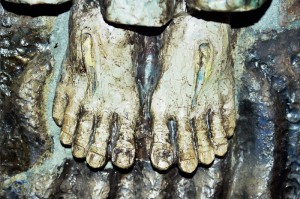Het eerste grote reliëf links toont het verschijnen van de ziel voor Christus (afb. 3 en 3a). Het is geïnspireerd door het begin van de Apokalyps waarin Johannes schrijft: Toen ik Hem zag viel ik als dood voor Zijn voeten. Maar Hij legde zijn rechterhand op mij en sprak: "Vrees niet. Ik ben het, de eerste en de laatste, de levende" (Apok 1,17). De Latijnse tekst lezen we in de voorstelling: Noli timere: ego sum primus, et novissimus, et vivus.