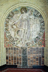De reliëfs hebben als onderwerp de wederkomst van Christus aan het einde der tijden en het binnengaan van de zielen in het hemelse Jeruzalem, zoals Johannes de evangelist dit beschrijft in zijn Apokalyps.