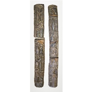 Twee reliëfs, h. 110 cm, br. 12,5 cm, een ervan ges. r.o. Jac Maris