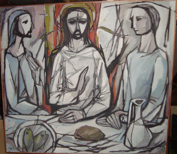 De Emmaüsgangers (Ted Felen)Acryl op doekDit werk werd in 1958 gemaakt door Ted Felen (1931-2016) voor een inmiddels opgeheven parochiekerk.Geschonken door de familie Felen.